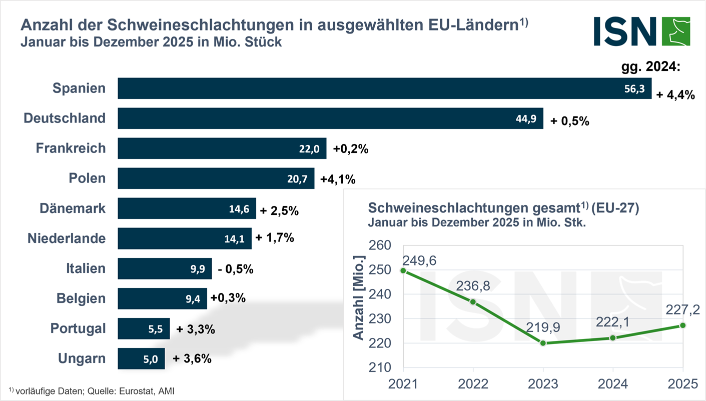 Mit knapp einem Viertel der gesamten EU-Schlachtungen bleibt Spanien das wichtigste Erzeugerland. Dort wurden die Schlachtungen im Jahresvergleich um 4,4 % ausgeweitet. Deutschland folgt weiterhin auf Rang zwei, wobei die Schlachtzahlen gegenüber 2024 nahezu stabil blieben. In den meisten großen Erzeugerländern wurden ebenfalls Zuwächse registriert, nur vereinzelt gab es leichte Rückgänge.