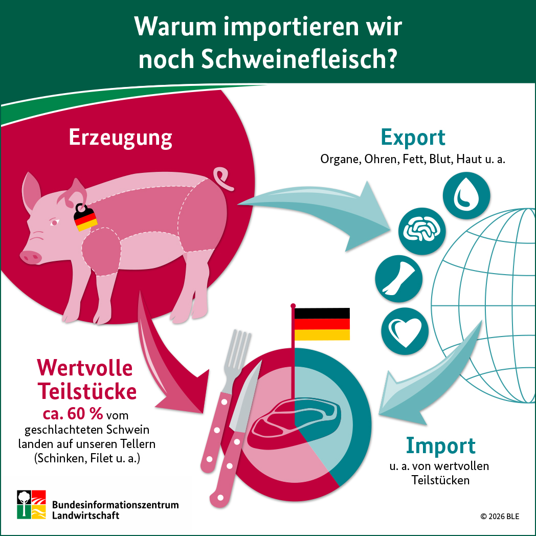 Trotz eines weiterhin hohen Selbstversorgungsgrades von rund 115 Prozent bleibt Deutschland auf Fleischimporte angewiesen. Weil der Fleischverbrauch 2025 stieg, erhöhten sich die Einfuhren von Fleisch und Innereien um fast elf Prozent auf 3,6 Millionen Tonnen.