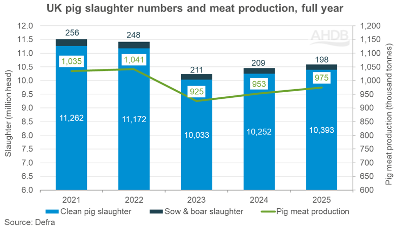 Die Schweinebranche in Großbritannien verzeichnete 2025 ein weiteres starkes Jahr. Nach Angaben der britischen Absatzförderungsorganisation für Landwirtschaft und Gartenbau (AHDB) stieg die Schweinefleischproduktion laut aktuellen Daten des britischen Landwirtschaftsministeriums Defra um 2,3 % auf insgesamt 975.200 Tonnen.