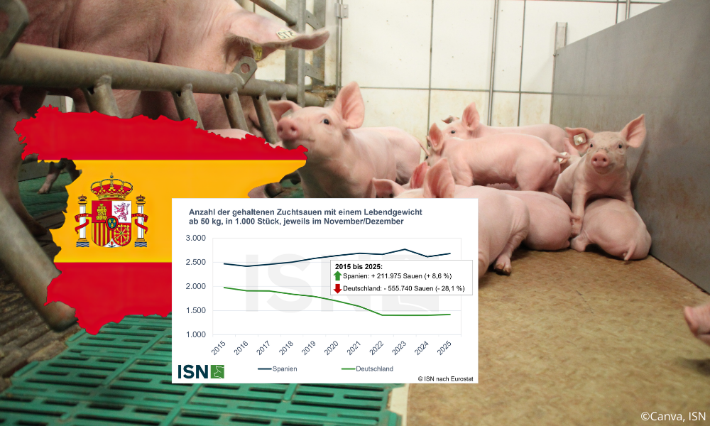 Im Zehnjahresvergleich zeigt sich eine deutliche gegensätzliche Entwicklung zwischen der Schweinhaltung in Spanien und in Deutschland: Während der Schweinebestand in Spanien seit 2015 um 18,6 % angestiegen ist und der Zuchtsauenbestand um 8,6 % gestiegen ist, ging der Schweinebestand in Deutschland im selben Zeitraum um 22,1 % zurück. Der Zuchtsauenbestand verringerte sich hierzulande sogar um 28,1 %.