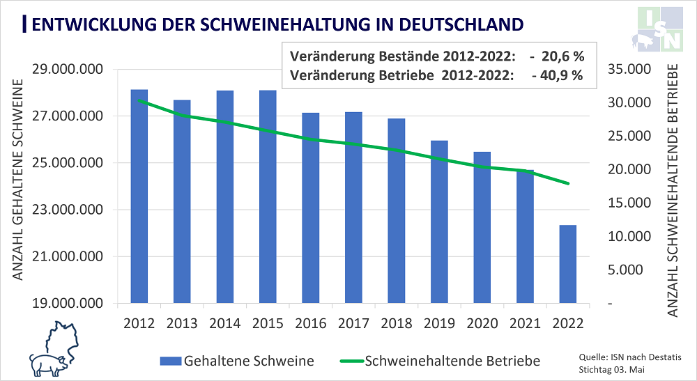 Der Schweinebestand in Deutschland ist in den letzten 10 Jahren um über 20 % zurückgegangen - Die Anzahl schweinehaltender Betriebe hat sich in dem Zeitraum fast halbiert © ISN nach Destatis