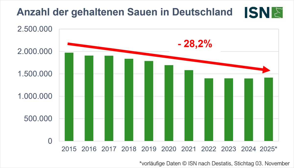 Die Zahl der gehaltenen Sauen in Deutschland hat sich in den letzten 10 Jahren deutlich reduziert - zuletzt wurde allerdings wieder ein leichtes Plus verzeichnet ©ISN nach Destatis