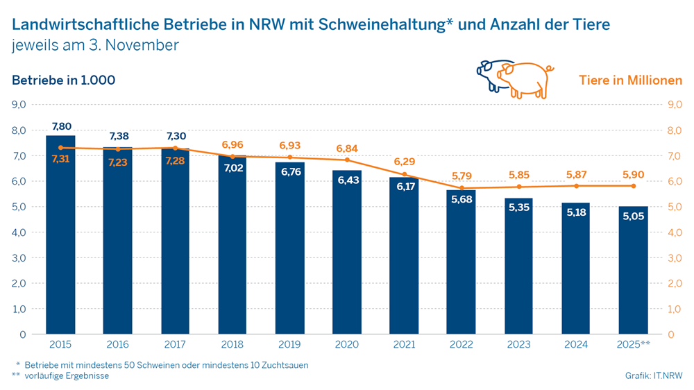 In Nordrhein‑Westfalen hielten am Stichtag 5.050 Betriebe Schweine, was einem Rückgang von 2,5 % gegenüber dem Vorjahr entspricht. Insgesamt wurden rund 5,90 Millionen Schweine registriert, ein leichtes Plus von 0,5 %. Besonders stark wuchsen die Bestände bei Jungschweinen (+ 24,7 %) und Ferkeln (+ 4,2 %), während die Zahl der Mastschweine über 50 kg um 10,4 % sank. Die Zahl der Sauen stieg leicht auf 336.300 Tiere (+ 2,6 %).